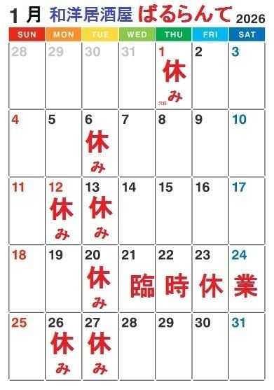 ※ 和洋居酒屋 ばるらんて 5月定休日案内 ※