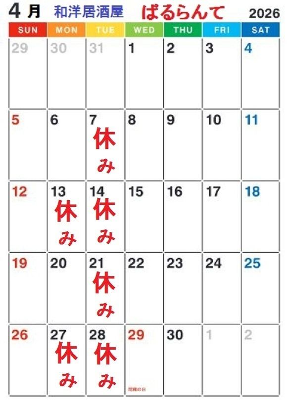 ※ ばるらんて4月定休日ご案内 ※